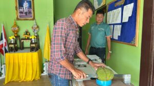 วันที่ 5 มีนาคม 2568 นายชานนท์ เข็มทอง เกษตรอำเภอบ่อไร่ มอบหมายให้เจ้าหน้าที่สำนักงานเกษตรอำเภอบ่อไร่ ให้บริการตรวจเปอร์เซ็นต์น้ำหนักแห้งในเนื้อทุเรียน ตามมาตรการ “ทุเรียนตราด ตรวจก่อนตัด สร้างมาตรฐานทุเรียนตราดให้มีคุณภาพ” ภายใต้การดำเนินการป้องกันทุเรียนด้อยคุณภาพออกสู่ตลาด จังหวัดตราด ซึ่งมีเกษตรกรขอรับบริการตรวจเปอร์เซ็นต์น้ำหนักแห้งในเนื้อทุเรียนก่อนตัดโดยนำทุเรียนพันธุ์กระดุม จำนวน 1 ตัวอย่าง จากเกษตรกร 1 ราย เพื่อเป็นแนวทางในการเก็บเกี่ยวทุเรียนคุณภาพ ณ สำนักงานเกษตรอำเภอบ่อไร่ จังหวัดตราด