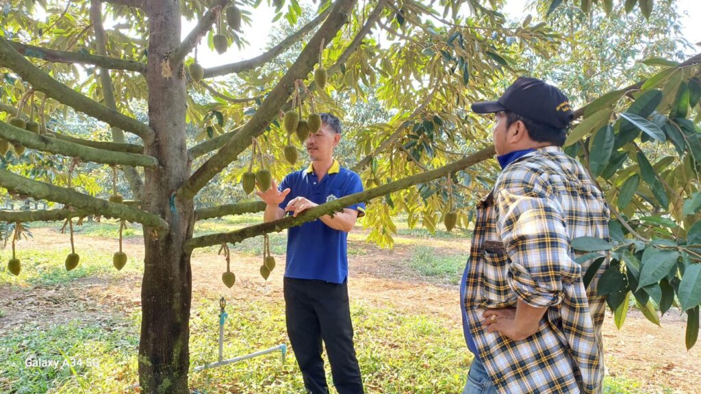วันศุกร์ที่ 13 กุมภาพันธ์ 2568 นางสาววิชชุดา ตองอ่อน เกษตรอำเภอเขาสมิง มอบหมายให้ เจ้าหน้าที่สำนักงานเกษตรอำเภอเขาสมิง ลงพื้นที่ติดตามสถานการณ์การผลิตไม้ผล เพื่อเตรียมการคาดคะเนผลผลิตทุเรียนในปี พ.ศ. 2568 พร้อมทั้งให้คำแนะนำในการผลิตทุเรียนให้ได้คุณภาพ ณ หมู่ที่ 2 ตำบลท่าโสม อำเภอเขาสมิง จังหวัดตราด