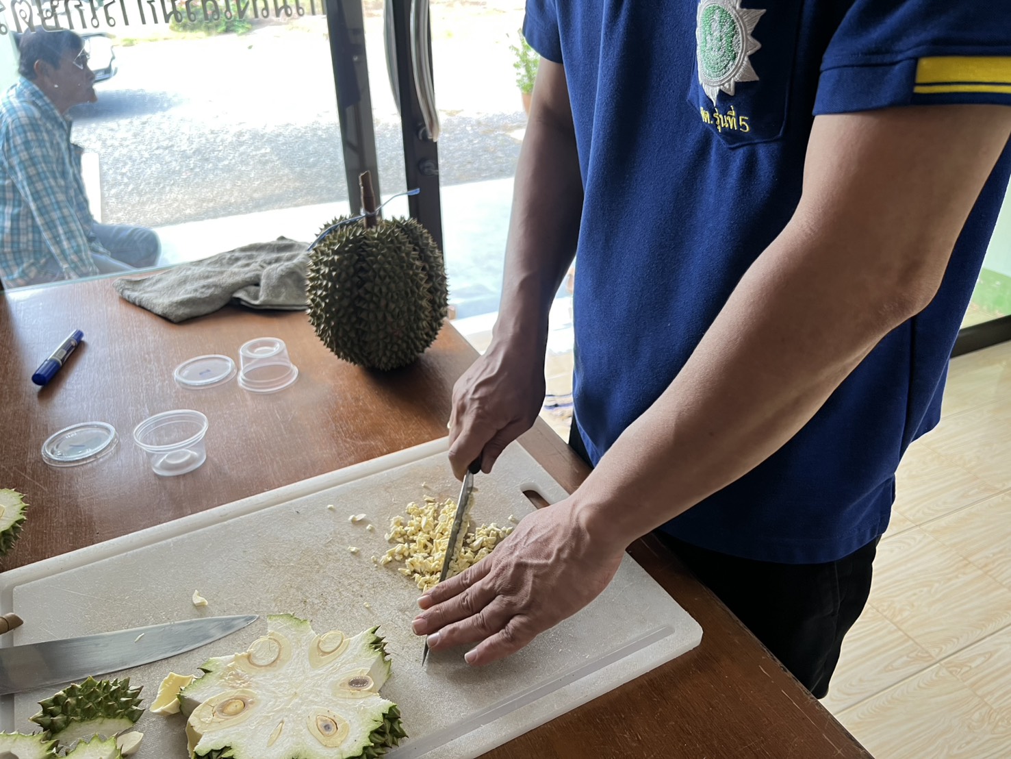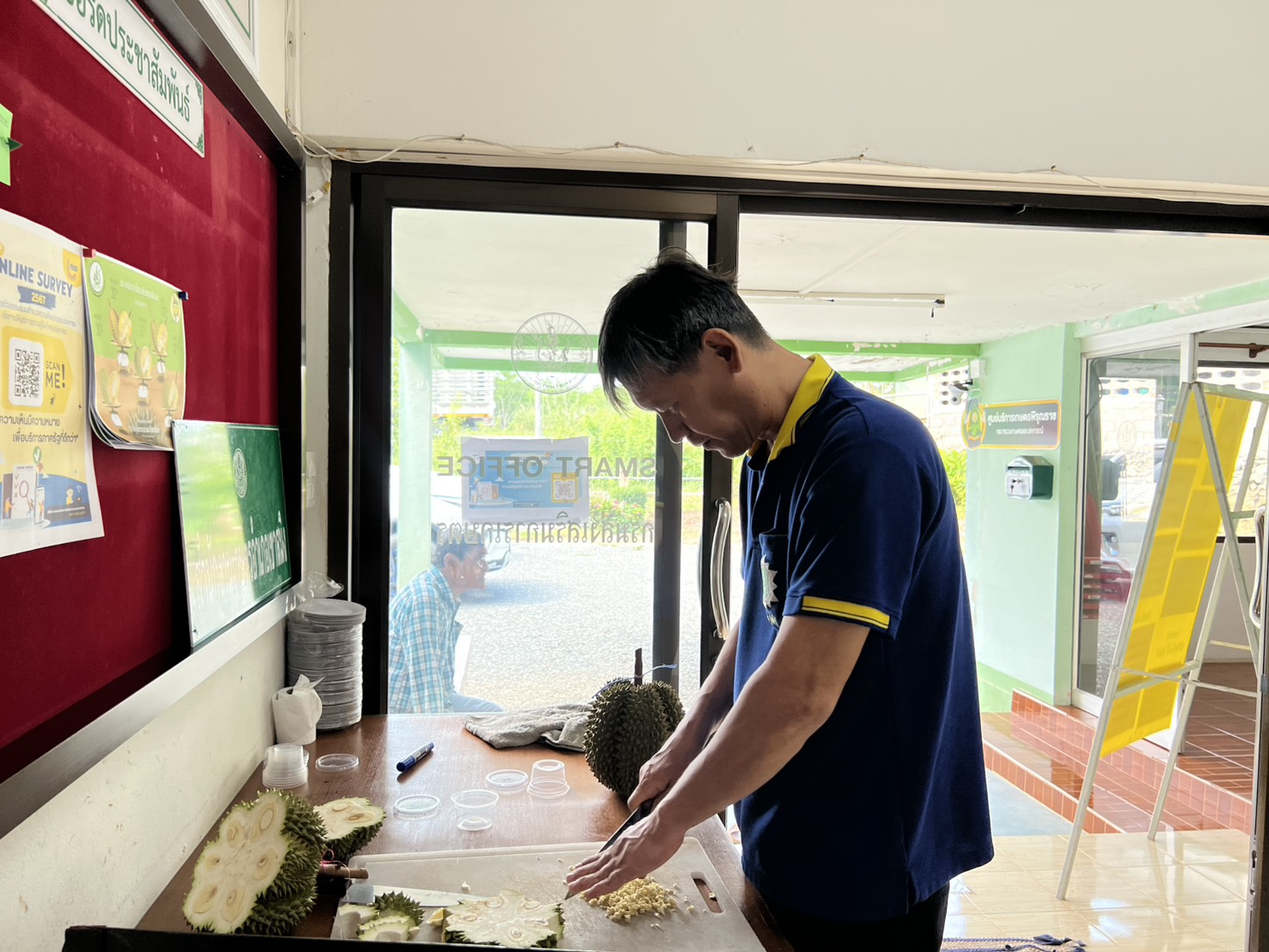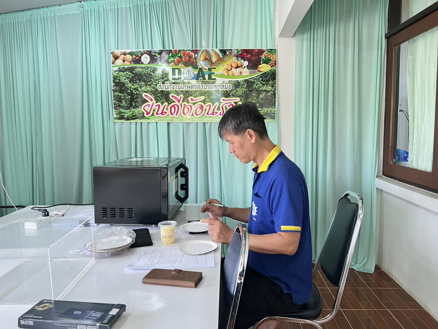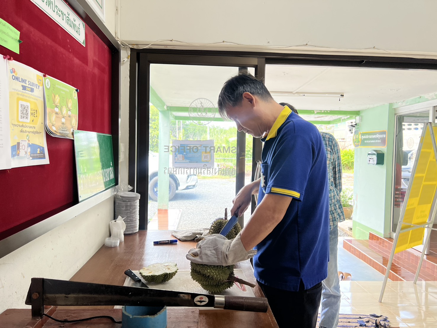 วันศุกร์ที่ 28 กุมภาพันธ์ 2568 นางชนัญกาญจน์ บัญญวัตวิวัฒน์ นักวิชาการส่งเสริมการเกษตรชำนาญการพิเศษ รักษาราชการแทน เกษตรอำเภอเขาสมิง พร้อมด้วย เจ้าหน้าที่สำนักงานเกษตรอำเภอเขาสมิง ให้บริการตรวจเปอร์เซ็นต์น้ำหนักแห้งในเนื้อทุเรียน โดยมีเกษตรกรนำทุเรียนพันธุ์กระดุม ขอรับบริการตรวจเปอร์เซ็นต์น้ำหนักแห้งในเนื้อทุเรียนก่อนตัด จำนวน 2 ตัวอย่าง จากเกษตรกร 1 ราย เพื่อเป็นแนวทางในการเก็บเกี่ยวทุเรียนคุณภาพ สร้างมาตรฐานทุเรียนตราดให้มีคุณภาพ และสร้างความเชื่อมั่นให้กับผู้บริโภค ณ สำนักงานเกษตรอำเภอเขาสมิง จังหวัดตราด