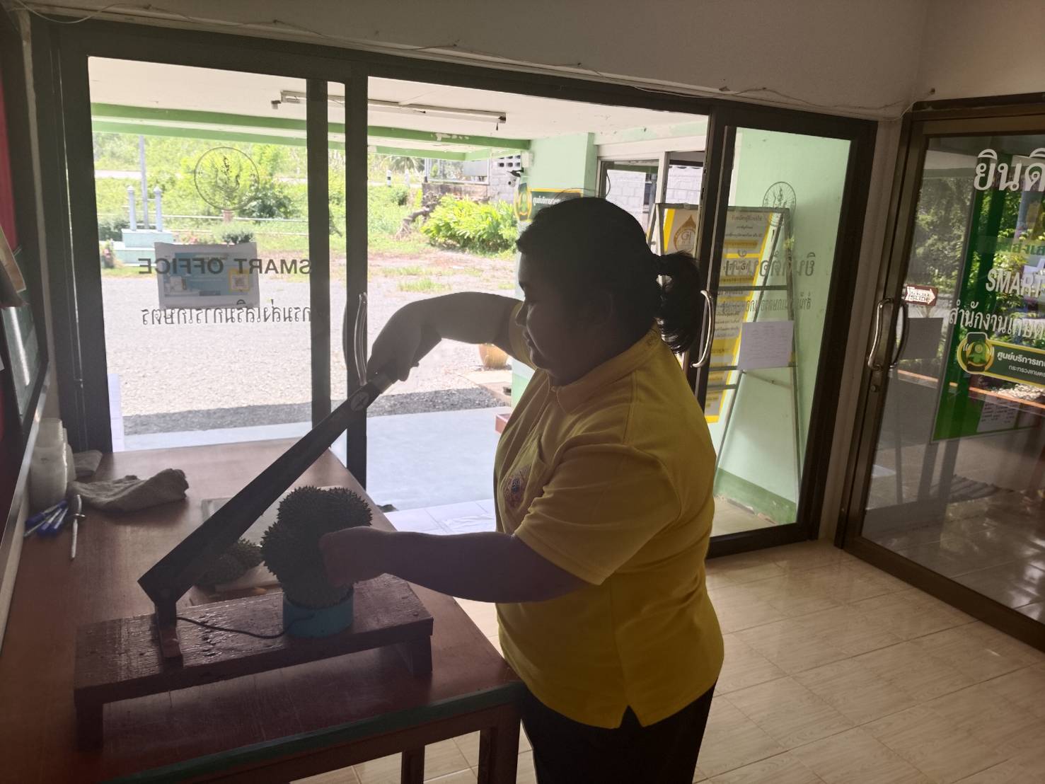 วันจันทร์ที่ 10 มีนาคม 2568 นางชนัญกาญจน์ บัญญวัตวิวัฒน์ นักวิชาการส่งเสริมการเกษตรชำนาญการพิเศษ รักษาราชการแทน เกษตรอำเภอเขาสมิง พร้อมด้วย เจ้าหน้าที่สำนักงานเกษตรอำเภอเขาสมิง ให้บริการตรวจเปอร์เซ็นต์น้ำหนักแห้งในเนื้อทุเรียน โดยมีเกษตรกรนำทุเรียนพันธุ์กระดุม และพันธุ์พวงมณี ขอรับบริการตรวจเปอร์เซ็นต์น้ำหนักแห้งในเนื้อทุเรียนก่อนตัด จำนวน 3 ตัวอย่าง จากเกษตรกร 3 ราย เพื่อเป็นแนวทางในการเก็บเกี่ยวทุเรียนคุณภาพ สร้างมาตรฐานทุเรียนตราดให้มีคุณภาพ และสร้างความเชื่อมั่นให้กับผู้บริโภค ณ สำนักงานเกษตรอำเภอเขาสมิง จังหวัดตราด