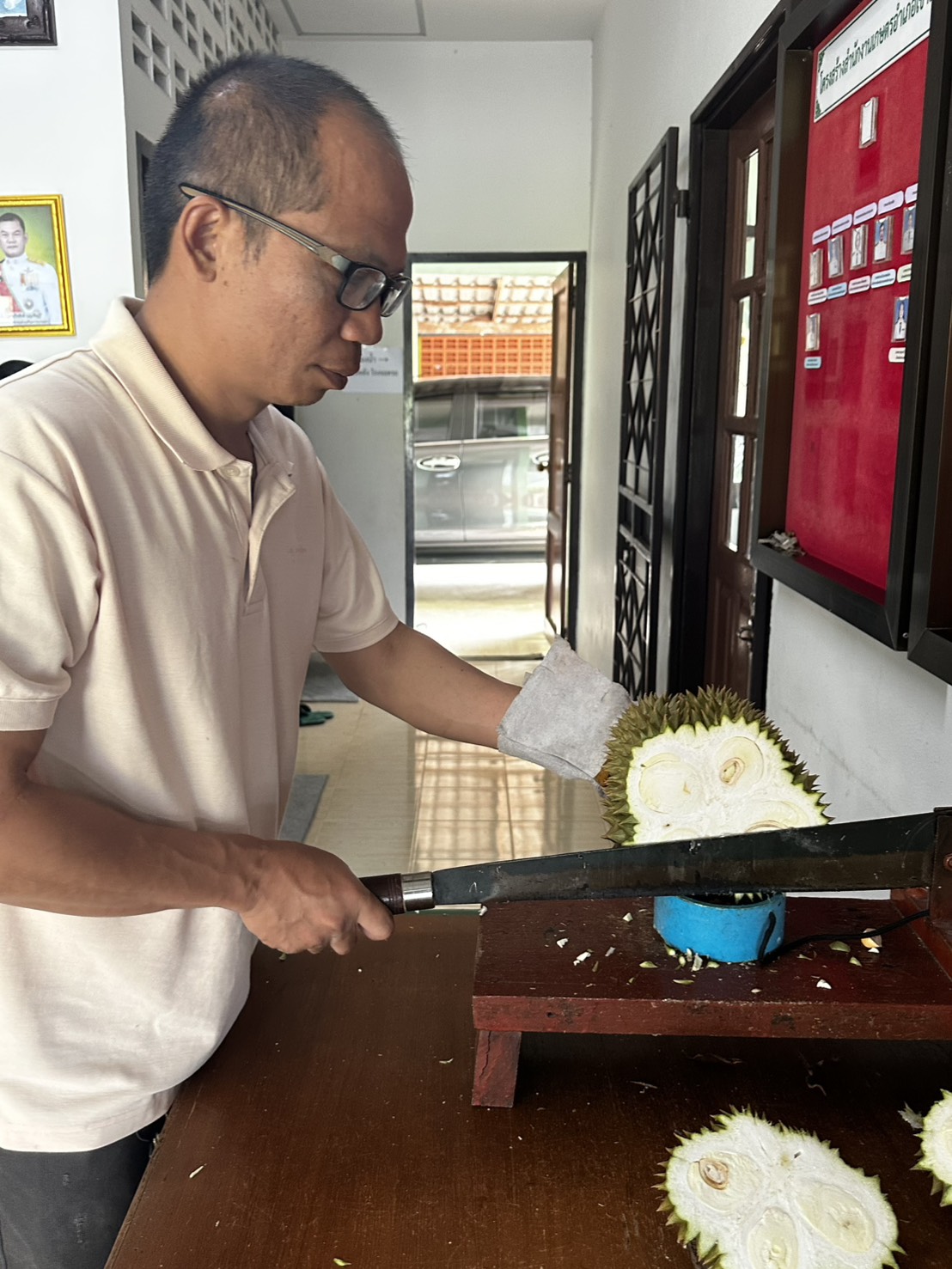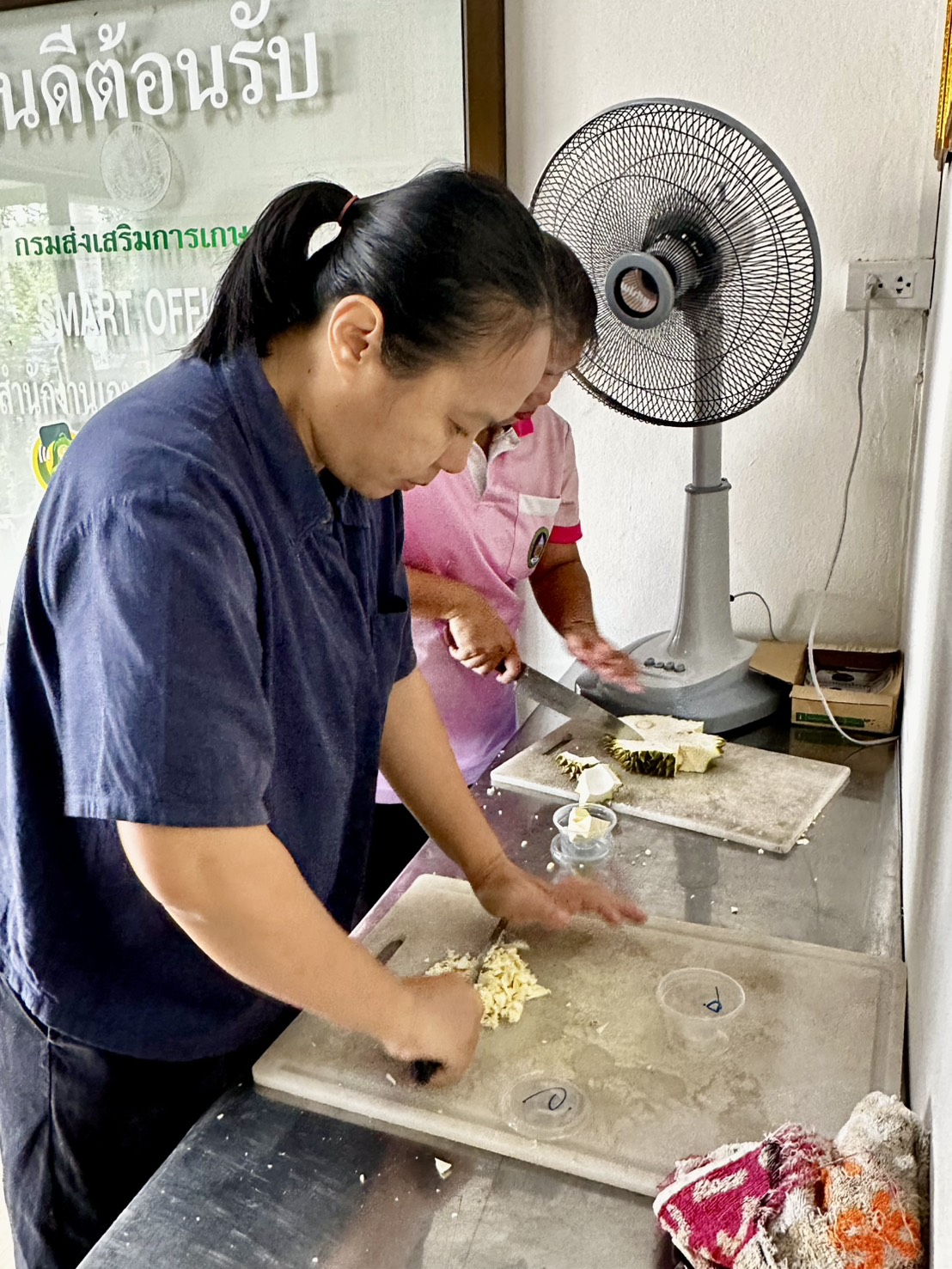 วันพฤหัสบดีที่ 27 มีนาคม 2568 นางชนัญกาญจน์ บัญญวัตวิวัฒน์ นักวิชาการส่งเสริมการเกษตรชำนาญการพิเศษ รักษาราชการแทน เกษตรอำเภอเขาสมิง พร้อมด้วย เจ้าหน้าที่สำนักงานเกษตรอำเภอเขาสมิง ให้บริการตรวจเปอร์เซ็นต์น้ำหนักแห้งในเนื้อทุเรียน โดยมีเกษตรกรนำทุเรียนพันธุ์หมอนทอง และพันธุ์กระดุม ขอรับบริการตรวจเปอร์เซ็นต์น้ำหนักแห้งในเนื้อทุเรียนก่อนตัด จำนวน 22 ตัวอย่าง เพื่อเป็นแนวทางในการเก็บเกี่ยวทุเรียนคุณภาพ สร้างมาตรฐานทุเรียนตราดให้มีคุณภาพ และสร้างความเชื่อมั่นให้กับผู้บริโภค ณ สำนักงานเกษตรอำเภอเขาสมิง จังหวัดตราด