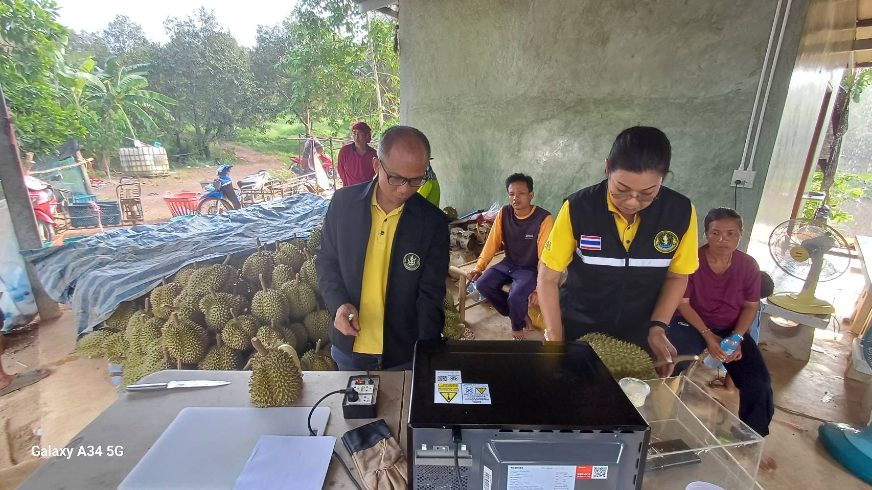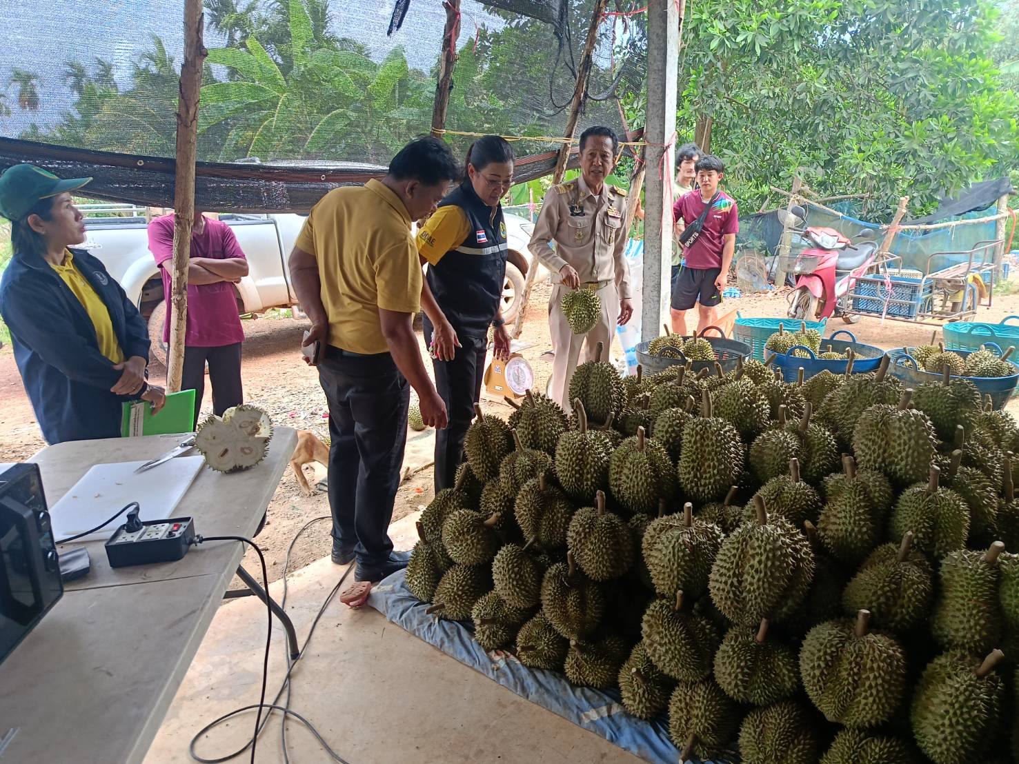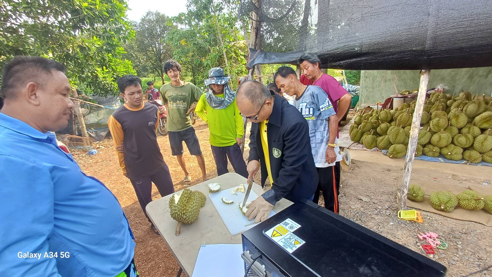 วันที่ 21 เมษายน 2568 นายวินัย ขยันยิ่ง เกษตรจังหวัดตราด พร้อมด้วย นหัวหน้ากลุ่มฯและเกษตรอำเภอเขาสมิง ร่วมกับผู้นำชุมชน ลงพื้นที่ ตรวจสอบ เกษตรกร โดย ให้คำแนะนำการเก็บเกี่ยวผลผลิตทุเรียน ตามมาตรการ “ทุเรียนตราด ตรวจก่อนตัด สร้างมาตรฐานทุเรียน” ภายใต้การดำเนินการป้องกันทุเรียนด้อยคุณภาพออกสู่ตลาด จังหวัดตราด ณ พื้นที่ตำบลสะตอ อำเภอเขาสมิง จังหวัดตราด พบ ว่ามี การตัดทุเรียนด้อยคุณภาพ(ทุเรียนอ่อน) บางส่วน จึงได้แจ้งให้เกษตรกรหยุดการตัดและ คัดทุเรียนที่ด้อยคุณภาพ(ทุเรียนอ่อน )ออก ทำสัญลักษณ์โดยการพ่นสีแดงเพื่อป้องกันทุเรียนด้อยคุณภาพ(ทุเรียนอ่อน )ออกสู่ท้องตลาดจังหวัดตราด