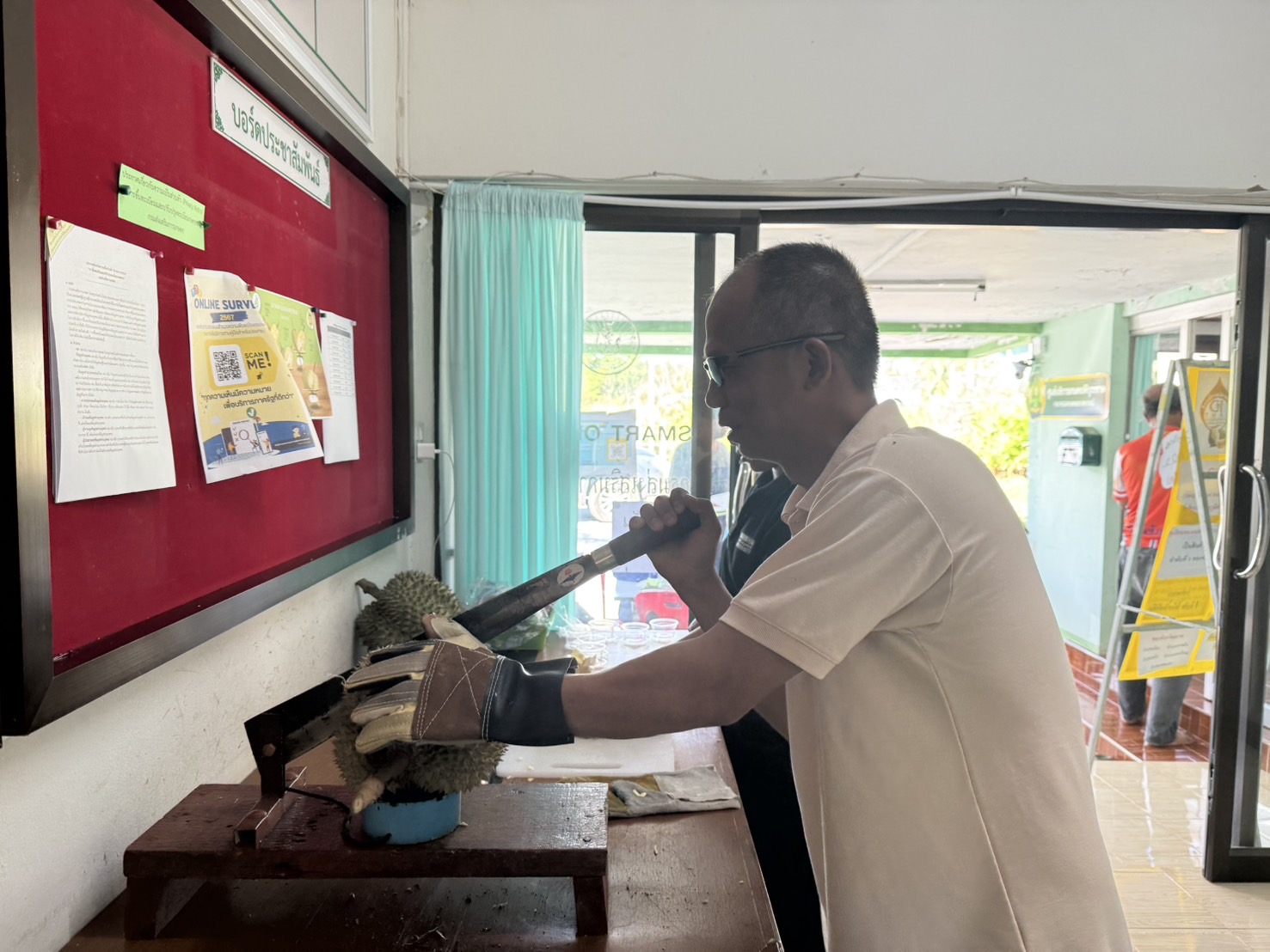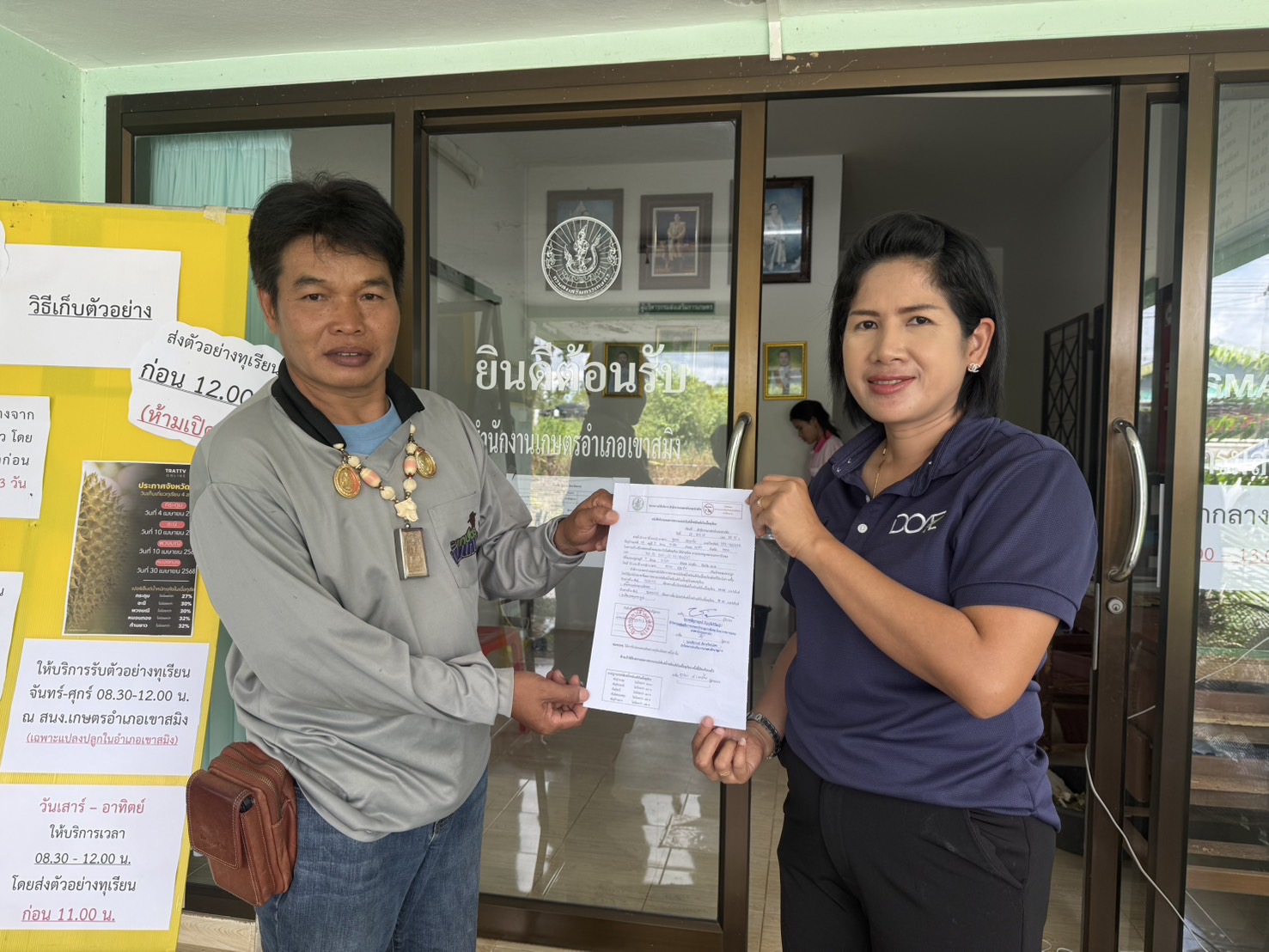 วันศุกร์ที่ 25 เมษายน 2568 นางชนัญกาญจน์ บัญญวัตวิวัฒน์ นักวิชาการส่งเสริมการเกษตรชำนาญการพิเศษ รักษาราชการแทน เกษตรอำเภอเขาสมิง พร้อมด้วย เจ้าหน้าที่สำนักงานเกษตรอำเภอเขาสมิง ให้บริการตรวจเปอร์เซ็นต์น้ำหนักแห้งในเนื้อทุเรียน โดยมีเกษตรกรนำทุเรียนขอรับบริการตรวจเปอร์เซ็นต์น้ำหนักแห้งในเนื้อทุเรียนก่อนตัด จำนวน 84 ตัวอย่าง เพื่อเป็นแนวทางในการเก็บเกี่ยวทุเรียนคุณภาพ สร้างมาตรฐานทุเรียนตราดให้มีคุณภาพ และสร้างความเชื่อมั่นให้กับผู้บริโภค พร้อมทั้งสร้างความเข้าใจในการใช้สิทธิ์ การละเมิดการใช้สิทธิ์ การป้องกันการสวมสิทธิ์ใบรับรอง GAP แก่เกษตรกร ณ สำนักงานเกษตรอำเภอเขาสมิง จังหวัดตราด