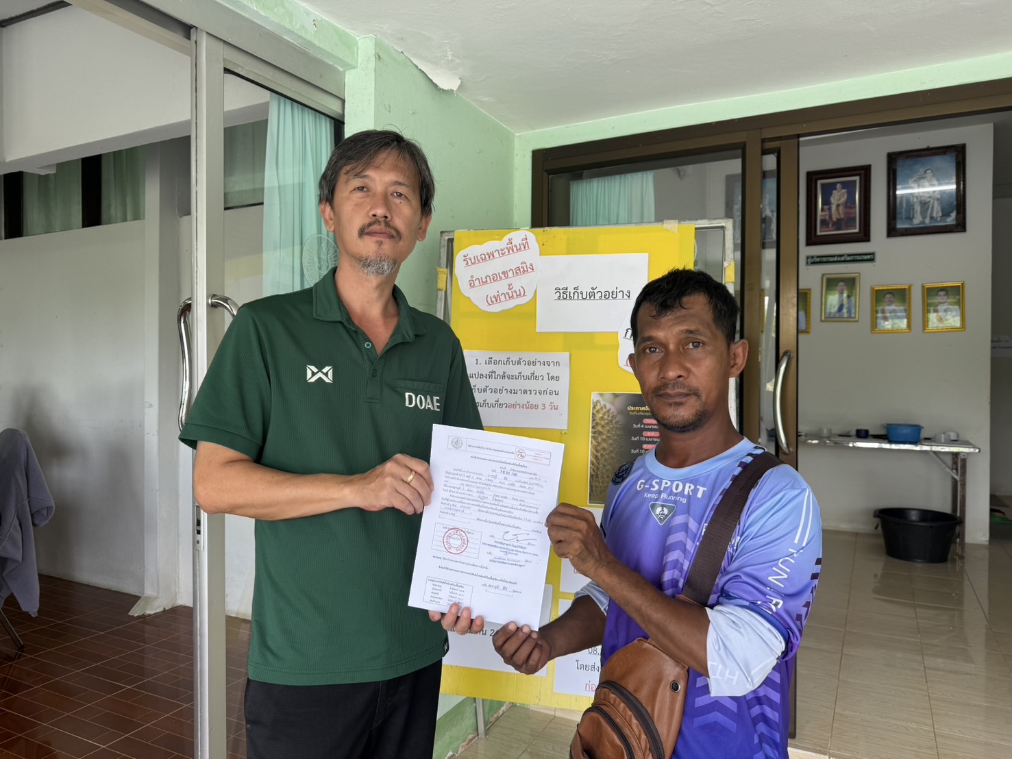 วันพุธที่ 30 เมษายน 2568 นางชนัญกาญจน์ บัญญวัตวิวัฒน์ นักวิชาการส่งเสริมการเกษตรชำนาญการพิเศษ รักษาราชการแทน เกษตรอำเภอเขาสมิง มอบหมายให้ เจ้าหน้าที่สำนักงานเกษตรอำเภอเขาสมิง ให้บริการตรวจเปอร์เซ็นต์น้ำหนักแห้งในเนื้อทุเรียน โดยมีเกษตรกรนำทุเรียนขอรับบริการตรวจเปอร์เซ็นต์น้ำหนักแห้งในเนื้อทุเรียนก่อนตัด จำนวน 29 ตัวอย่าง เพื่อเป็นแนวทางในการเก็บเกี่ยวทุเรียนคุณภาพ สร้างมาตรฐานทุเรียนตราดให้มีคุณภาพ และสร้างความเชื่อมั่นให้กับผู้บริโภค พร้อมทั้งสร้างความเข้าใจในการใช้สิทธิ์ การละเมิดการใช้สิทธิ์ การป้องกันการสวมสิทธิ์ใบรับรอง GAP แก่เกษตรกร ณ สำนักงานเกษตรอำเภอเขาสมิง จังหวัดตราด