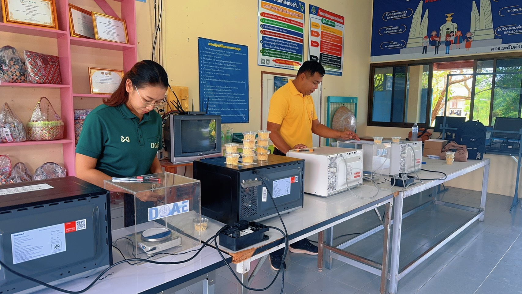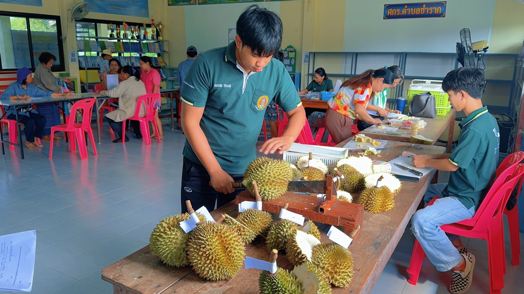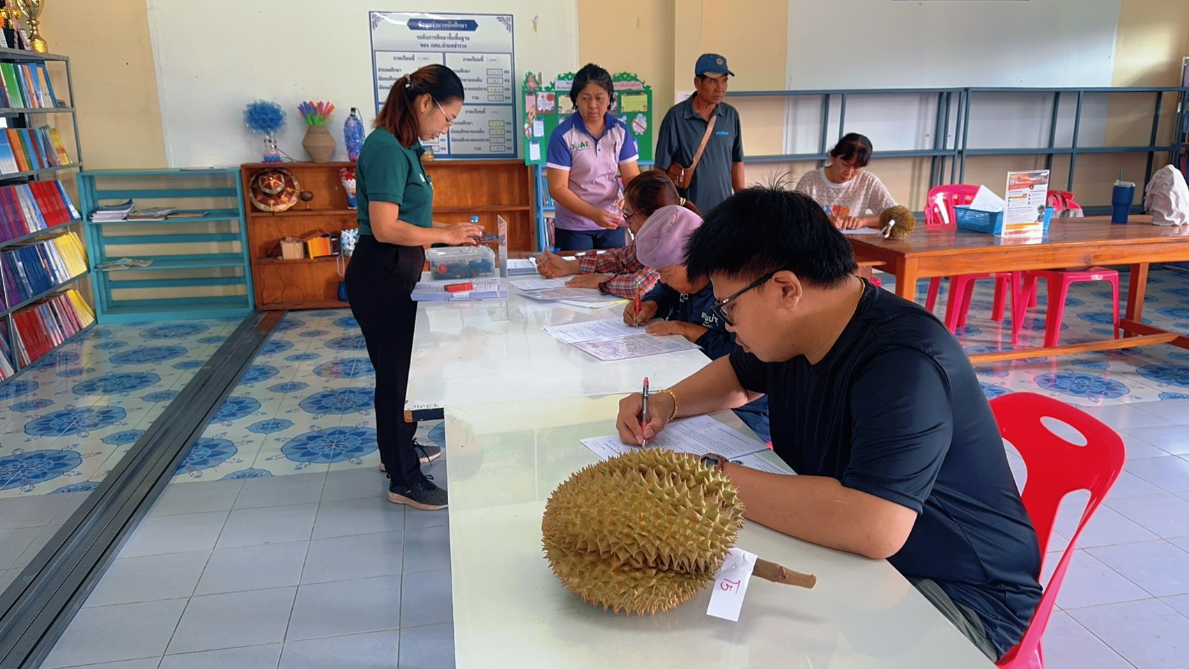 วันที่ 2 เมษายน 2568 นางสาวมรกต สุดประเสริฐ เกษตรอำเภอเมืองตราด มอบหมายให้เจ้าหน้าที่สำนักงานเกษตรอำเภอเมืองตราด ให้บริการตรวจวัดเปอร์เซ็นต์น้ำหนักแห้งในเนื้อทุเรียนตามมาตรการ “ทุเรียนตราด ตรวจก่อนตัด สร้างมาตรฐานทุเรียนตราดให้มีคุณภาพ” ภายใต้การดำเนินการป้องกันทุเรียนด้อยคุณภาพออกสู่ตลาด จังหวัดตราด โดยมีเกษตรกรขอรับบริการตรวจเปอร์เซ็นต์น้ำหนักแห้งในเนื้อทุเรียนก่อนตัด จำนวน 34 ตัวอย่าง ณ ศาลาหมู่ที่ 1 ตำบลชำราก อำเภอเมืองตราด จังหวัดตราด