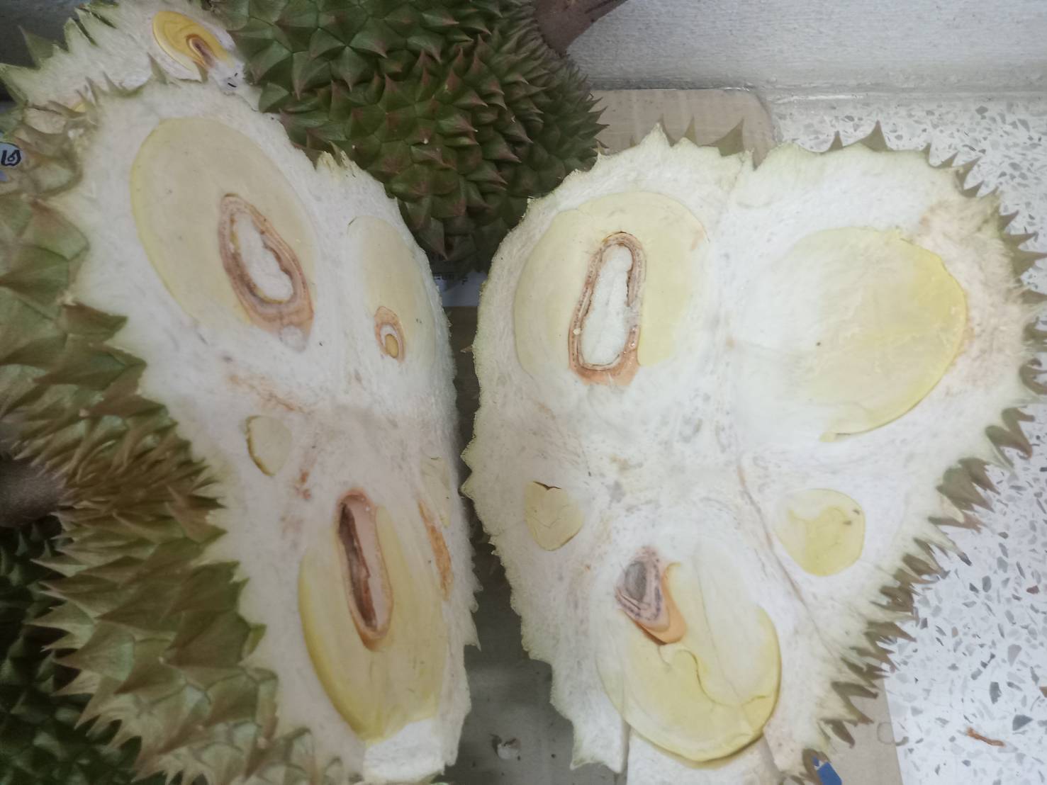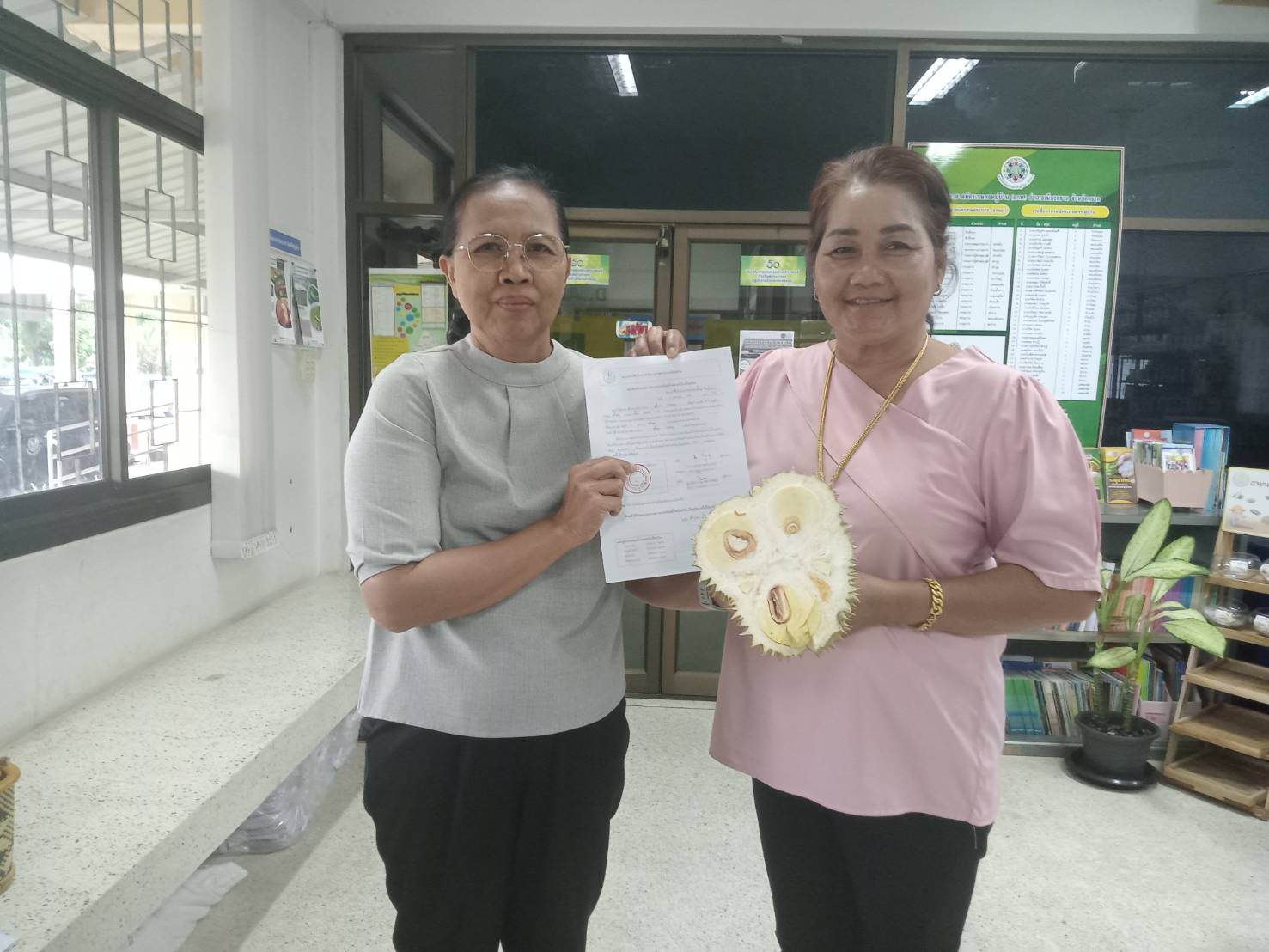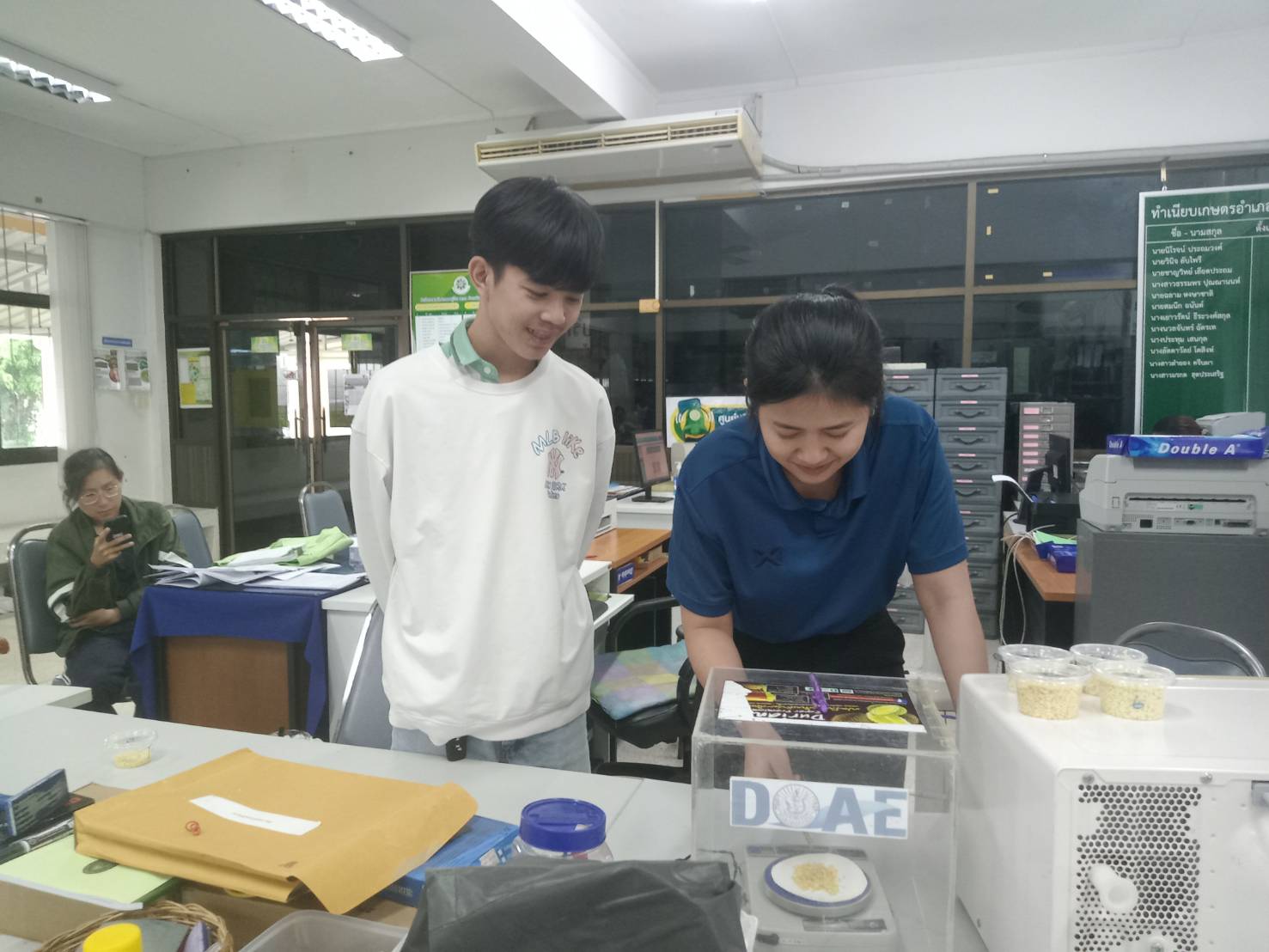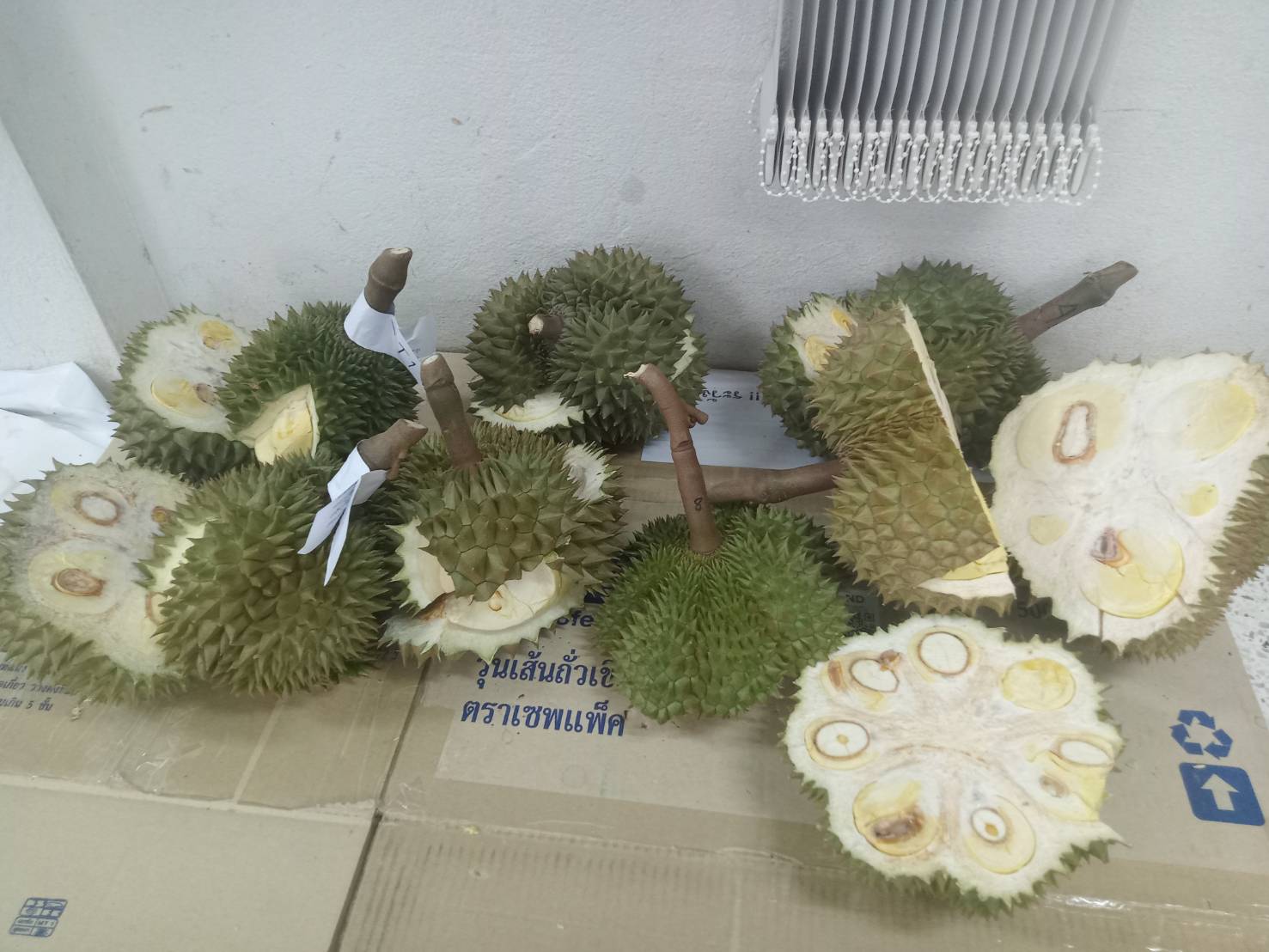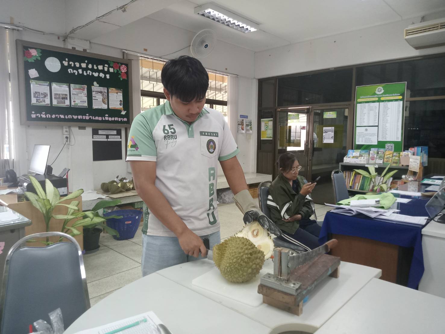 วันที่ 3 เมษายน 2568 นางสาวมรกต สุดประเสริฐ เกษตรอำเภอเมืองตราด พร้อมด้วยเจ้าหน้าที่สำนักงานเกษตรอำเภอเมืองตราด ให้บริการตรวจวัดเปอร์เซ็นต์น้ำหนักแห้งในเนื้อทุเรียนตามมาตรการ “ทุเรียนตราด ตรวจก่อนตัด สร้างมาตรฐานทุเรียนตราดให้มีคุณภาพ” ภายใต้การดำเนินการป้องกันทุเรียนด้อยคุณภาพออกสู่ตลาด จังหวัดตราด โดยมีเกษตรกรขอรับบริการตรวจเปอร์เซ็นต์น้ำหนักแห้งในเนื้อทุเรียนก่อนตัด จำนวน 8 ตัวอย่าง ณ สำนักงานเกษตรอำเภอเมืองตราด อำเภอเมืองตราด จังหวัดตราด