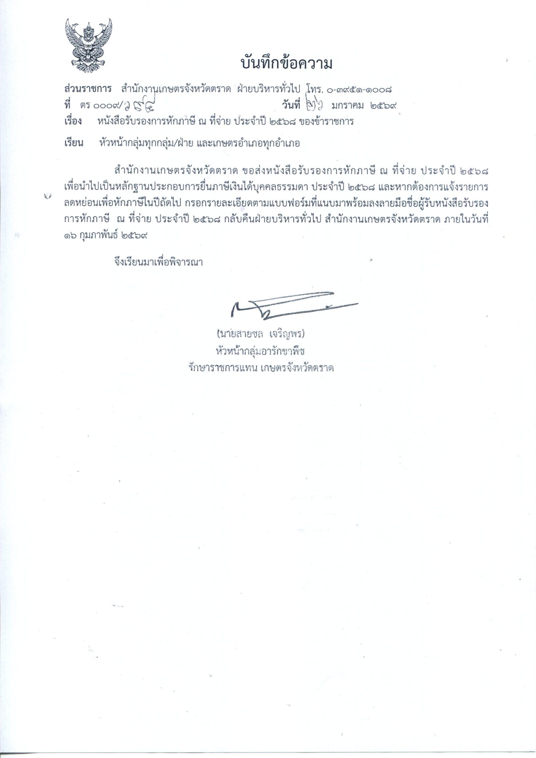 (เรียน เกษตรอำเภอทุกอำเภอ ) 27 ม.ค. 2569 เวลา 13.48 น.หนังสือรับรองการหักภาษี ณ ที่จ่าย ประจำปี 2568 ของข้าราชการ